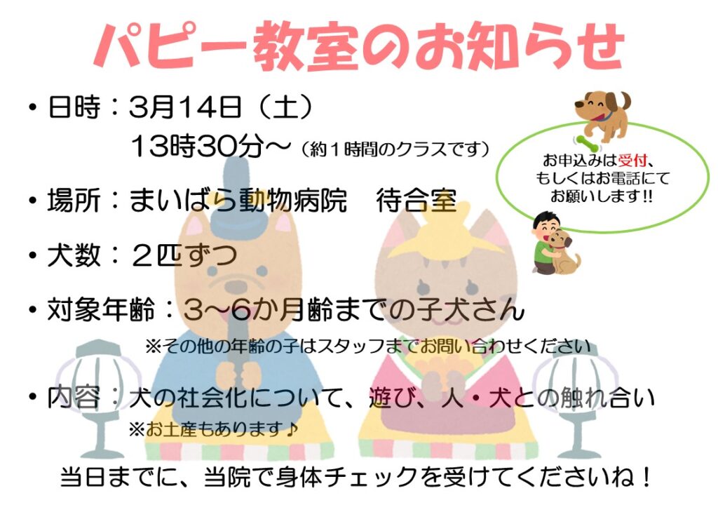 (※当院が初めての方は、一度診察(健康チェック)にお越しいただいてからパピー教室参加となります。)