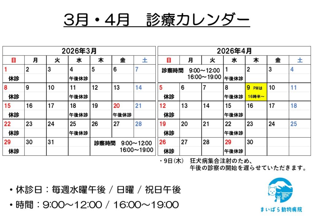 3月・4月の休診日のお知らせです。